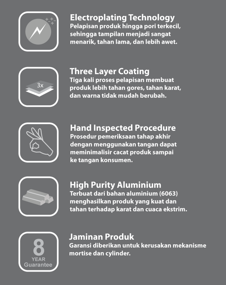 Dengan garansi 8 (delapan) tahun meliputi kerusakan mekanisme badan kunci dan silinder, ACCERO sangat cocok bagi Anda yang memerlukan produk kunci dengan harga ekonomis tanpa mengurangi rasa aman. Produk ACCERO telah diuji baik dari segi material maupun mekanisme sebelum sampai ketangan Anda.